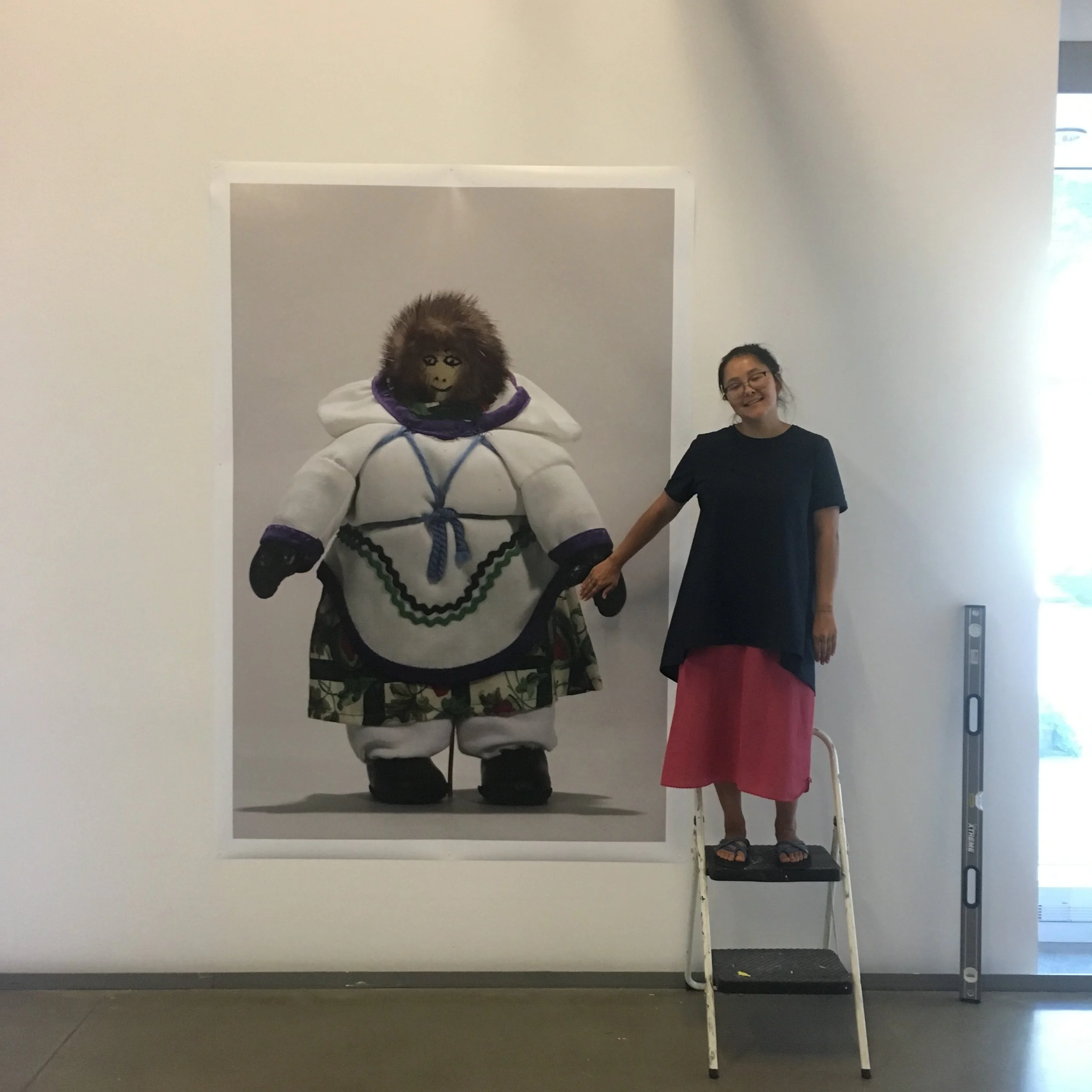 asinnajaq with a photo of her Grandmother (Inuk style) Elisapee Inukpuk’s doll. During an installation at FOFA Gallery. 2018.